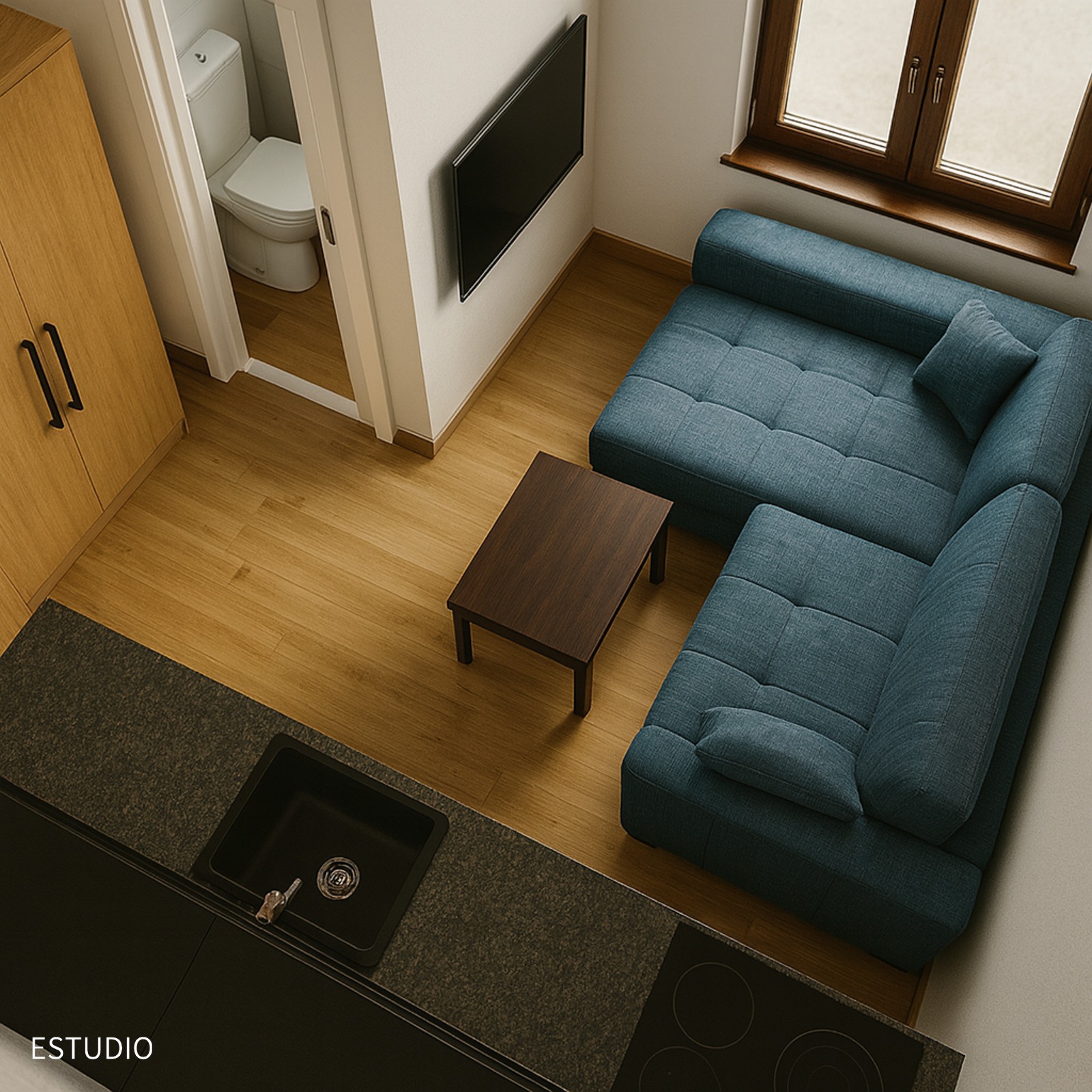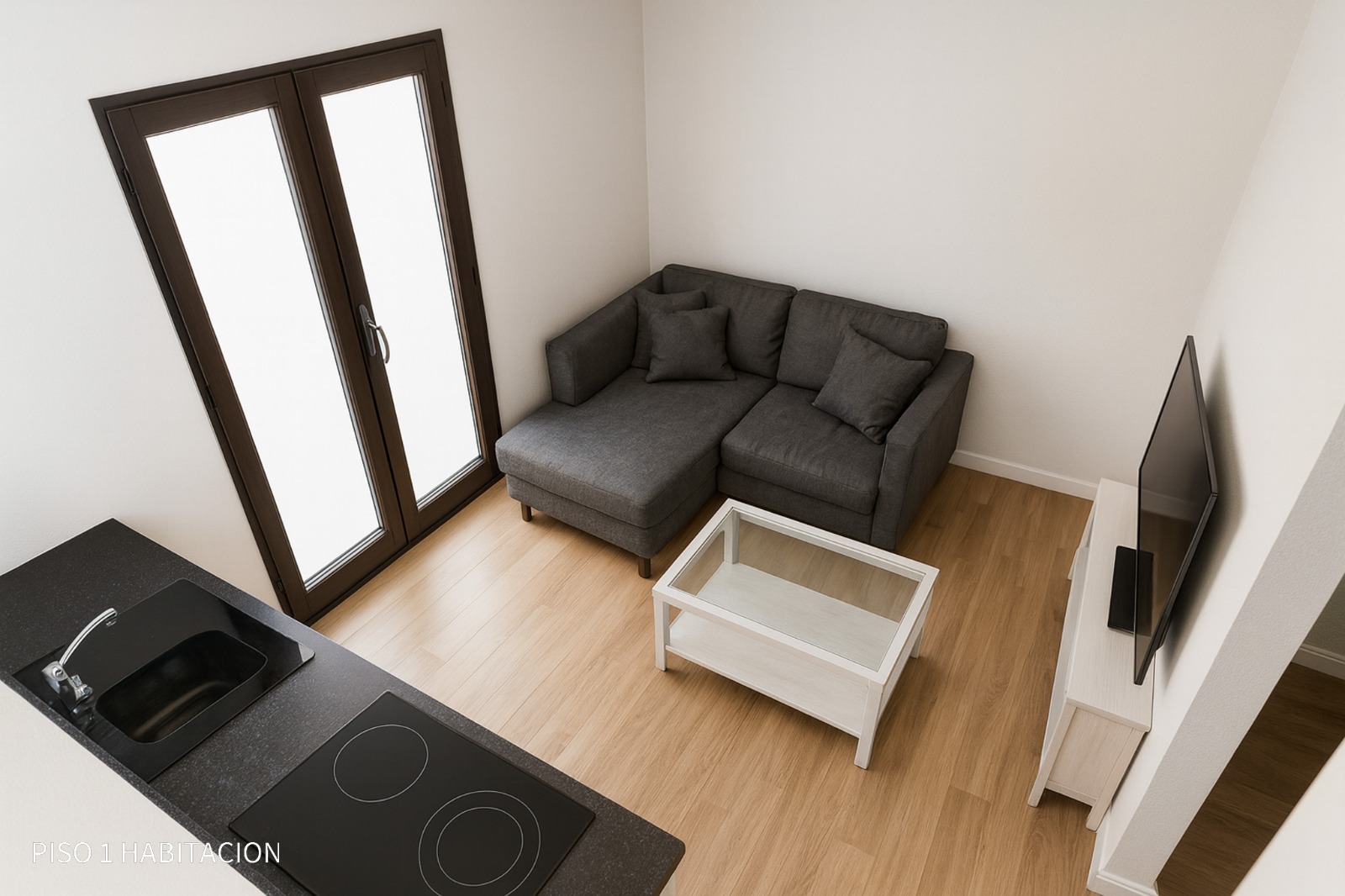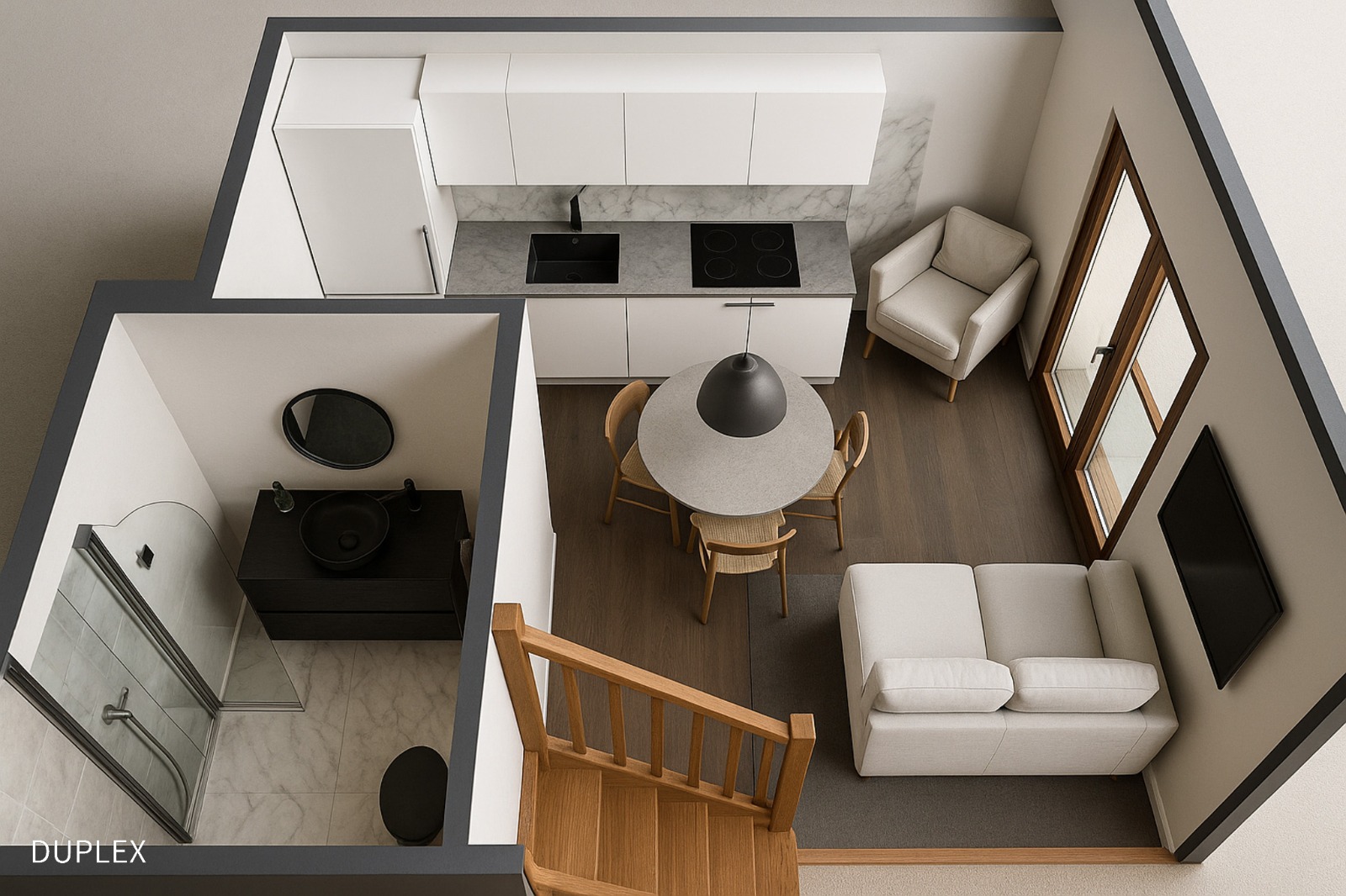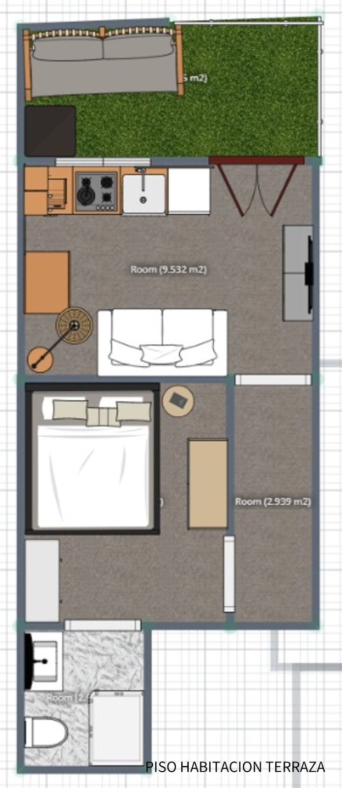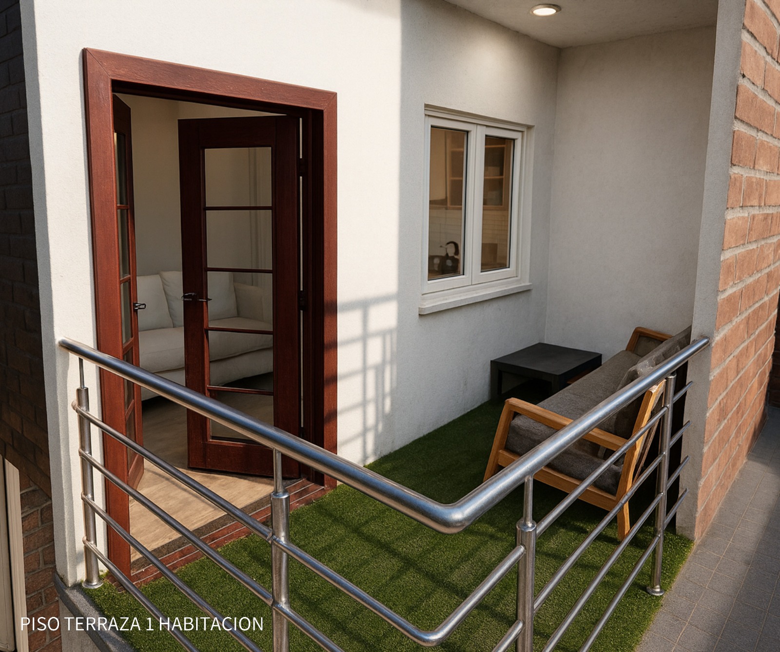 – Dúplex en la planta alta con cocina-comedor y baño en la parte inferior y habitación en la planta superior.